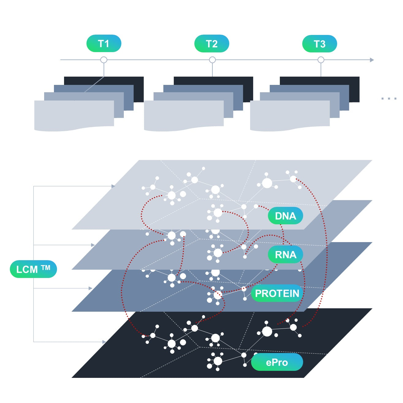Capture the "central dogma" of biomarkers: genomics (DNA) ► transcriptomics (RNA) ► proteomics (proteins). Every sample goes through the same standardized LCM™ assay for every timepoint collection to generate robust biomarker data.