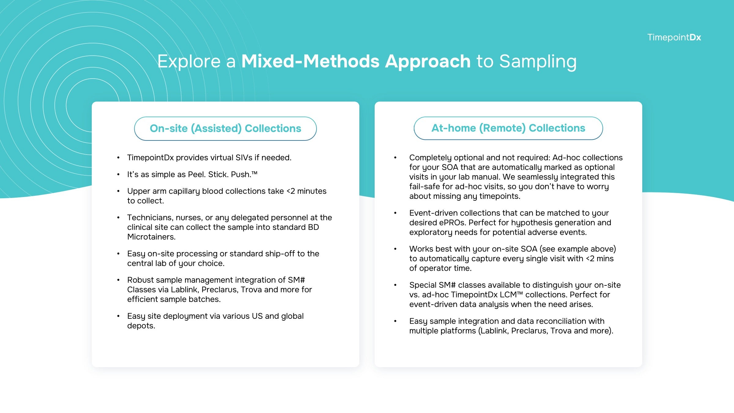 By the minute, hourly, daily, weekly, bi-weekly, monthly, quarterly, annually or as desired by your SOA/visit schedule. Drive true time-series exploratory biomarker discovery with point of care blood collection and LCM™.