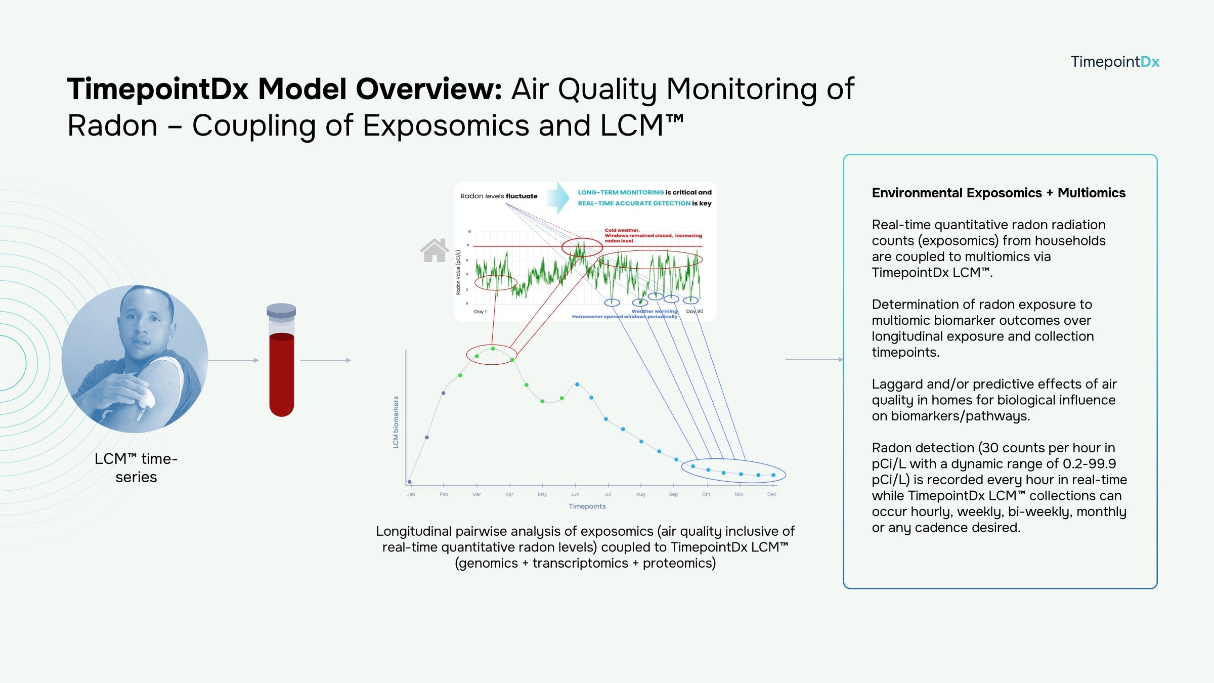 - TimepointDx LCM™ for in-home radon detection is the first real-time, high-sensitivity molecular characterization of environmental exposure (radon) via longitudinal capillary multiomics over multiple timepoints for families living in radon-afflicted homes.